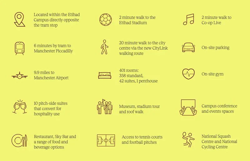 The hotel will feature 401 elegantly designed rooms, including 42 suites and a two-storey penthouse with private VIP access. Ten luxury pitch view rooms will serve as hotel rooms on non-event days and transform into exclusive hospitality spaces during matches and major events.